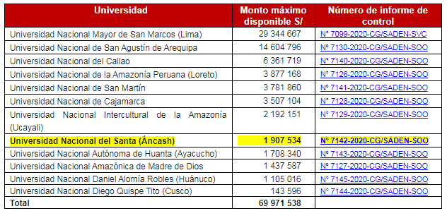 Huaraz en Línea.- La Contraloría General alertó que doce universidades públicas a nivel nacional pueden disponer de hasta de S/ 69 millones 971 mil 538 para garantizar la continuidad del servicio educativo durante la pandemia por COVID-19, sin embargo, no realizaron las modificaciones presupuestales para poder utilizar dichos recursos.