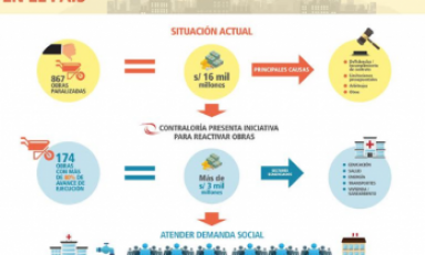 Un estudio exploratorio de la Contraloría General señala que en el país existen 867 obras públicas o proyectos paralizados, que representan una inversión de más de 16 mil millones de soles, las mismas que no se han culminado principalmente por causa de deficiencias o incumplimientos contractuales, limitaciones presupuestales, arbitrajes, entre otras.
