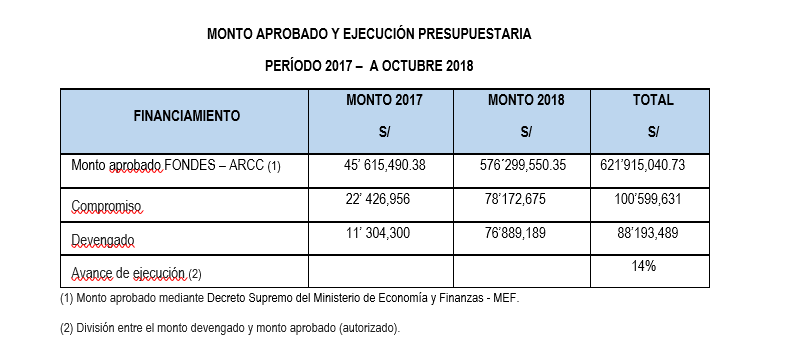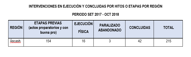 De setiembre de 2017 a octubre de 2018 existen 833 obras y servicios en estado de ejecución, de los cuales 112 se encuentran en ejecución física, 35 paralizadas y abandonadas y 686 en etapas previas (actos preparatorios y con buena pro).