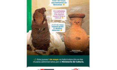 “¡Atención! Este 1 de mayo no habrá atención en los 56 museos administrados por el Ministerio de Cultura a nivel nacional”, posteó el sector Cultura, en la red social X.