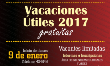 Huaraz en Línea.- Niños, niñas, adolescentes, jóvenes y adultos podrán acceder gratuitamente a los cursos del programa de Vacaciones Útiles 2017, promovido por la Dirección Desconcentrada de Cultura (DDC) Áncash, del Ministerio de Cultura; con la finalidad de desarrollar las capacidades creativas y artísticas del público en general.