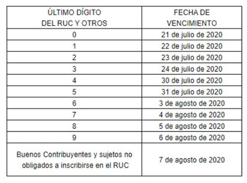 En ese sentido, se prorrogó la fecha de vencimientos de la declaración y pago del IR y del ITF del ejercicio 2019, para los contribuyentes que no tengan la calidad de Pricos y que en ese periodo facturaron hasta S/ 21 millones, de acuerdo con el presente cronograma: