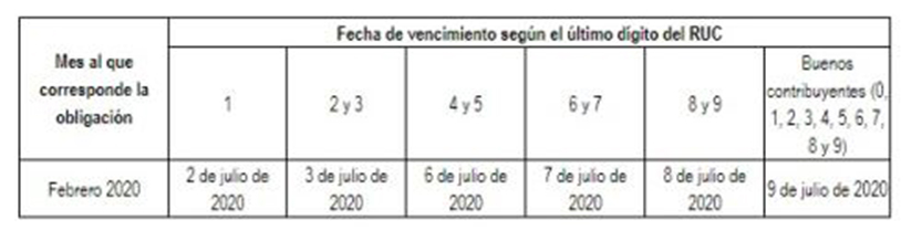 Asimismo, se amplió hasta el 09 de julio del presente año las fechas de vencimiento para la declaración y el pago del período febrero de 2020, en el caso de los contribuyentes cuyos ingresos no superen los 9 millones 660 mil (2 300 UIT), exceptuándose también a los Pricos.