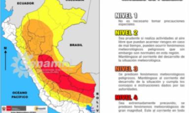 Huaraz en Línea.- El Servicio Nacional de Meteorología e Hidrología (Senamhi) emitió el primer aviso de nivel 4 del año, es decir, advierte sobre fenómenos peligrosos, por las lluvias de moderada a fuerte intensidad, acompañadas de descargas eléctricas y ráfagas de viento, que se registrarán desde hoy a escala nacional.