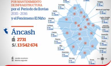 El monto ha sido distribuido entre las veinte provincias que conforman dicha región de la siguiente manera: Santa (S/.2 688 367), Huari (S/.1 360 229), Huaraz (S/.1 175 064), Yungay (S/.971 441), Huaylas (S/.904 674), Sihuas (S/.747 141), Pomabamba (S/.706 116), Pallasca (S/.643 972), Carhuaz (S/.633 288) y Mariscal Luzuriaga (S/.619 832).