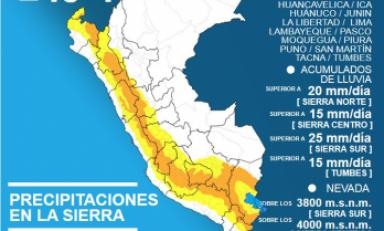 Dicha institución añade que en la sierra norte se registrarán acumulados mayores a los 20 milímetros por día, en la sierra centro por encima de los 15 milímetros por día y en la sierra sur superarán los 25 milímetros por día.