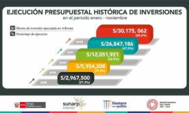 El monto ejecutado en inversiones a noviembre fue de S/ 30.1 millones, marcando un nuevo récord histórico, se trata de la ejecución más alta de los últimos 10 años, superando en 12% a lo ejecutado en el 2021 (S/ 26.7 millones).