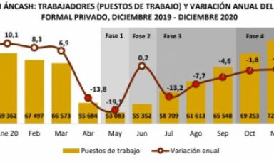 Respecto a la región Áncash, durante el periodo analizado hasta marzo del año 2020, el empleo formal presentó un crecimiento continuo, para luego registrar en los siguientes meses un decrecimiento, debido al estado de emergencia e inmovilización establecida por el gobierno.