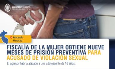 Huaraz en Línea.- El Cuarto Despacho de la Fiscalía Especializada en Violencia contra las Mujeres y los Integrantes del Grupo Familiar de Huaraz del Distrito Fiscal de Áncash, consiguió prisión preventiva por nueve meses contra Eduardo A. E. T. (57), investigado por la presunta violación sexual de una adolescente de 16 años.