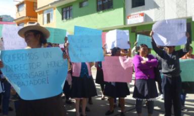 A través de una movilización, los padres de familia exigen la salida del ex director Pablo Cochachin quien, mediante una medida cautelar pretende volver al colegio pese a la negativa de los padres de familia.