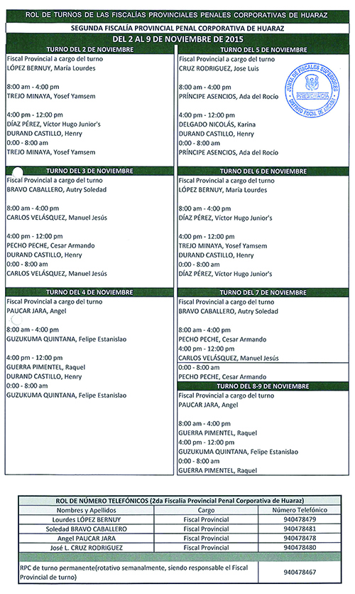 Huaraz en Línea.- La Presidencia de la Junta de Fiscales Superiores del Distrito Fiscal de Áncash, dispuso que a partir de esta semana se hará de conocimiento de la población el rol de la Fiscalía Penal de Turno Permanente.