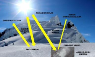 Es decir, el carbono negro tiene la particularidad de ser oscuro, con una alta capacidad de absorber la luz solar; por eso, al depositarse sobre los glaciares, los ennegrece y reduce su capacidad de reflectividad. Esto implica que los glaciares, absorban más energía solar, acelerando su derretimiento.