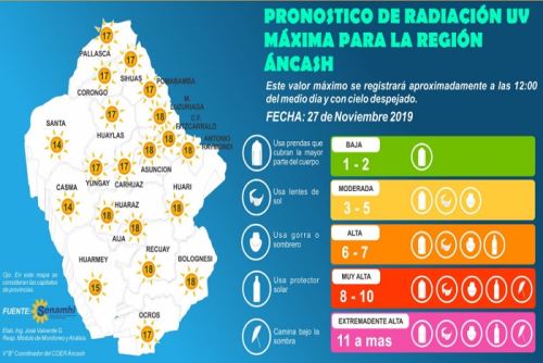 Huaraz en Línea.- Las 20 provincias de la región Áncash registran hoy niveles de radiación ultravioleta (UV) con valores entre 14 y 18, considerados como extremadamente altos, lo que constituye un peligro para la salud de la población, advirtió el Servicio Nacional de Meteorología e Hidrología (Senamhi).