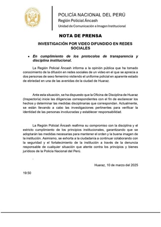 Mientras tanto, tras el escándalo desatado por las imágenes propaladas en redes sociales, donde se aprecia a dos agentes femeninas de la Policía Nacional, cayéndose de ebrias, la Región Policial de Áncash emitió el día de ayer un comunicado referido a este hecho.