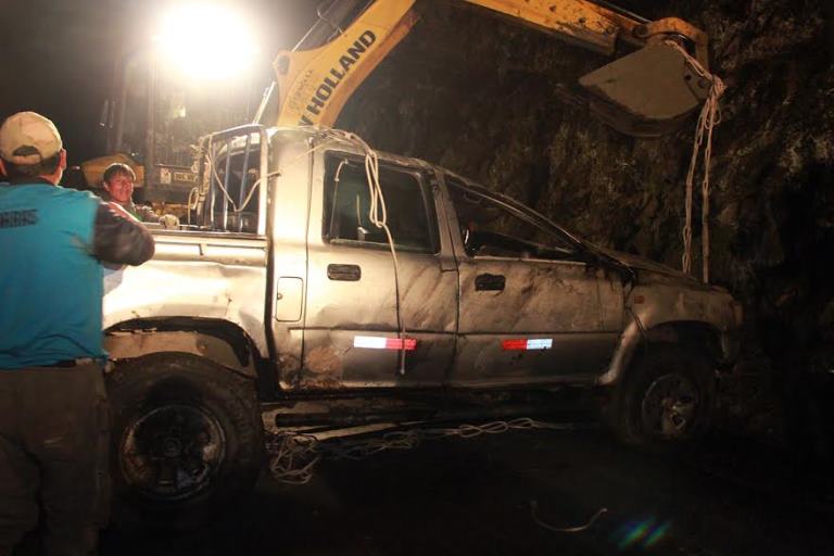 La camioneta que quedó a aire solo sostenida por el cable fue rescatada con maquinaria pesada de la comuna de Conchucos. (Redacción Central)