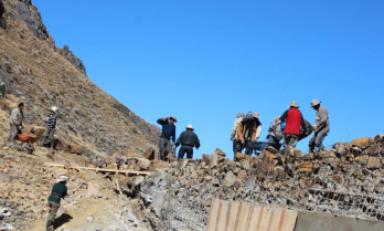 A más de 4 mil metros sobre el nivel del mar, los pobladores de los caseríos beneficiados, están trabajando de forma asociada construyendo el muro de contención a base de piedras, cemento y fierro; aportando con la mano de obra no calificada y en constante coordinación el ingeniero David de la Cruz, jefe de Infraestructura y el regidor Feliciano Robles.
