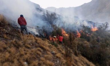 Personal edil, con apoyo de efectivos de Seguridad Ciudadana, del Grupo de Intervención Rápida para la Emergencia y Desastres del Gobierno Regional de Áncash y del Servicio Nacional de Áreas Naturales Protegidas por el Estado (SERNANP), realizan los trabajos de control y extinción del fuego, que se mantiene activo.