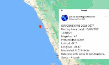 Huaraz en Línea. – Un fuerte movimiento sísmico de magnitud 4.1 en la escala de Richter se registró hoy jueves 16 de setiembre a las 1.58 p.m. en la ciudad de Chimbote, en la región Áncash.