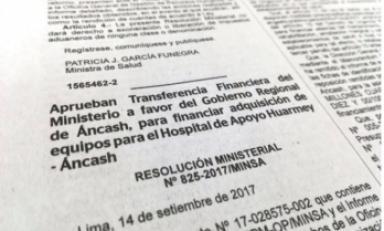 Huaraz en Línea.- El Ministerio de Salud (Minsa) autorizó hoy la transferencia de 3 millones 043,710 soles a favor del Gobierno Regional de Áncash con el propósito de financiar la adquisición de equipos por reposición para el Hospital de Apoyo Huarmey,