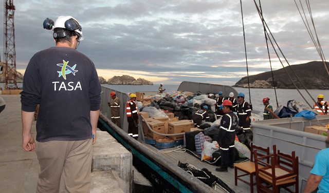 El primer barco en zarpar fue TASA315 que esta tarde llegó al muelle de Enapu Chimbote transportando 30 toneladas de ayuda consistente en víveres, ropa, agua y otros productos para los damnificados por los desastres naturales.